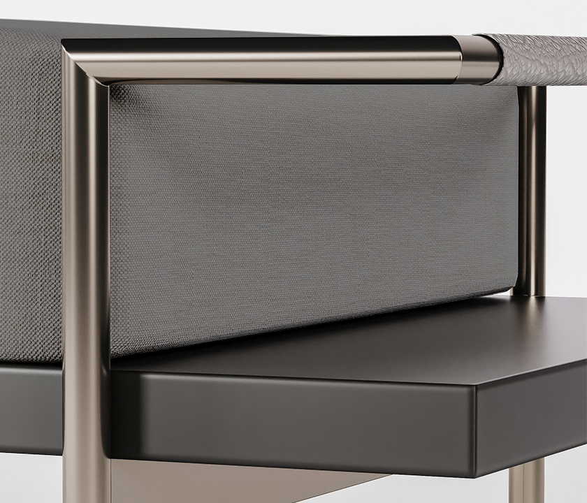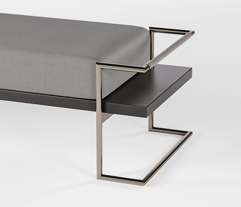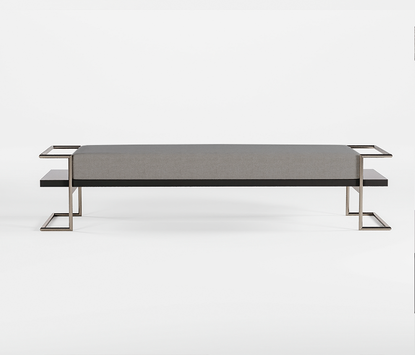 With architectural lines and precise detailing, this bench blends premium materials in a contemporary, functional design. The brushed metal frame supports a light upholstered seat, while the dark wood base adds visual depth and sophistication. Perfect for entryways, dressing rooms, foot-of-bed setups, or refined minimalist living spaces.