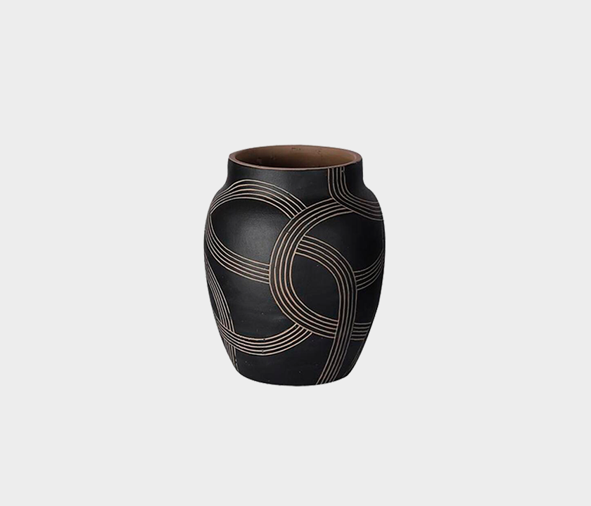 Elevate your space with this striking duo of handcrafted cement vases, featuring a bold matte black finish and sculpted line pattern. The carved curves create a graphic, architectural aesthetic that balances artistry and simplicity. With exposed terracotta interiors and smooth silhouettes, these vases suit modern, industrial or minimalist interiors. Style them together for maximum visual impact or separately across your space.