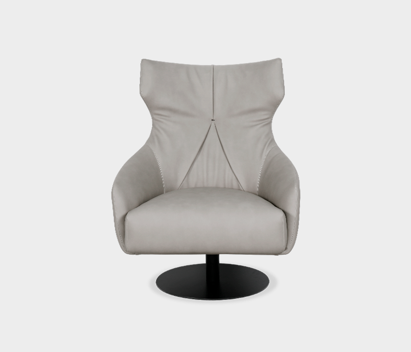 Defined by bold lines and enveloping comfort, this swivel armchair blends contemporary aesthetics with refined ergonomics. The smooth upholstered surface features sculpted pleats on the backrest, adding movement and visual interest. A circular metal base provides stability and lightness to the composition. Ideal for lounges, reading corners, or waiting areas that value signature design and function.