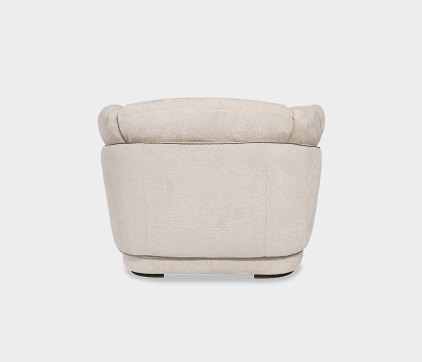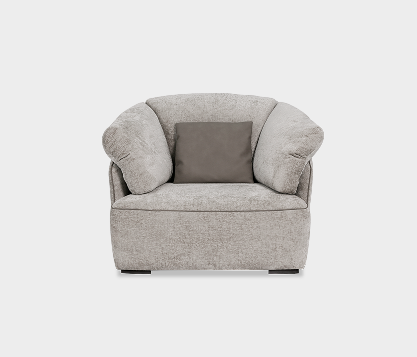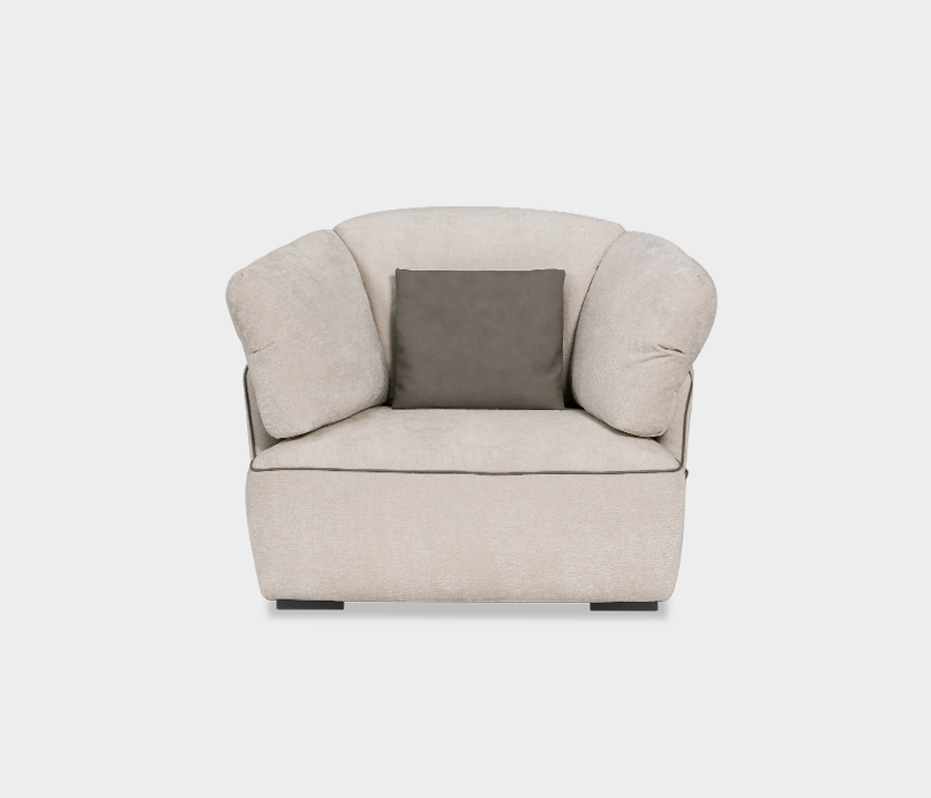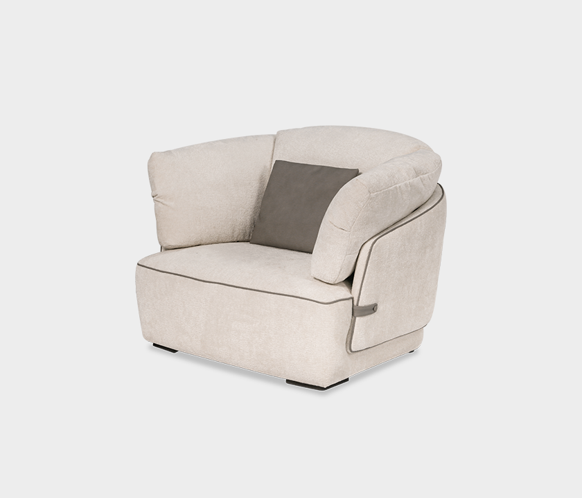 Warm and inviting, this generously proportioned armchair blends softness and structure in a refined contemporary design. The curved backrest envelops the body in comfort, while leather details and contrasting piping highlight its elegant silhouette. Perfect for living rooms, lounges, or master suites that embrace a sophisticated and tactile ambiance.