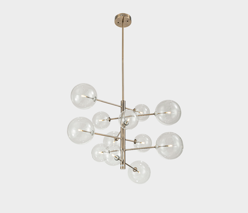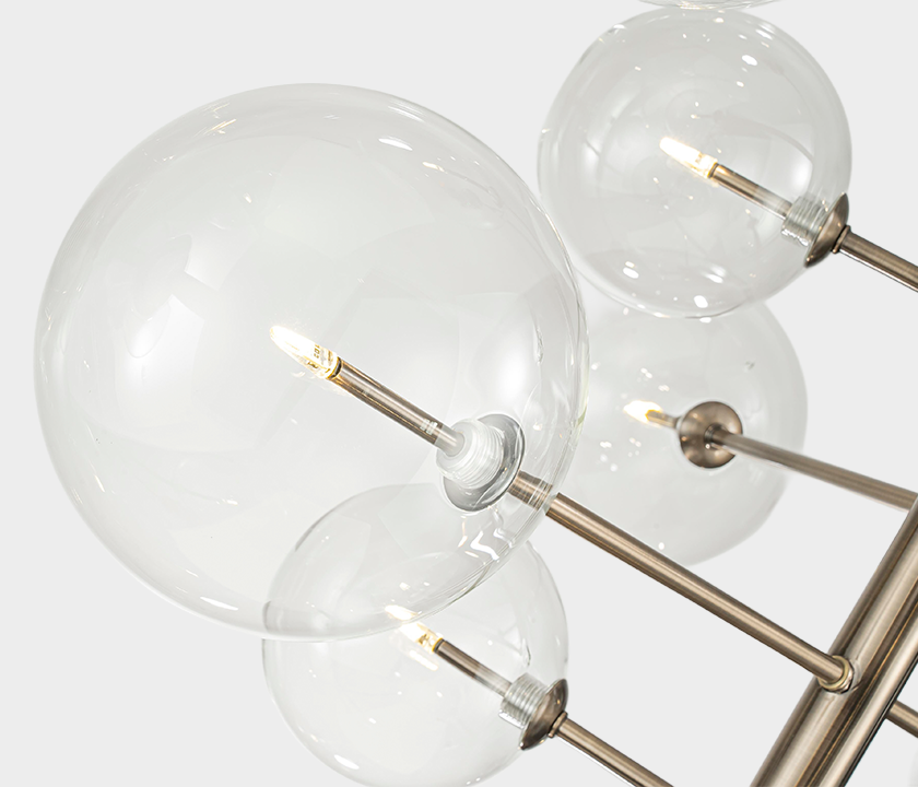 Featuring a satin gold metal frame adorned with clear glass bubbles, this chandelier creates an eye-catching display of light and form. Designed for larger rooms, its dynamic design is perfect for dining rooms, living areas, or grand foyers.