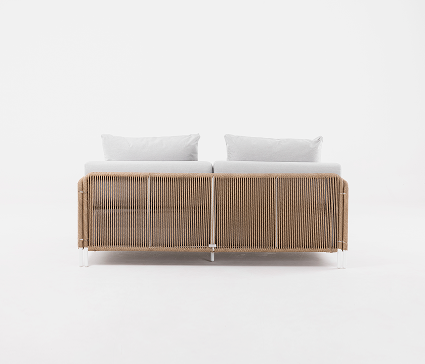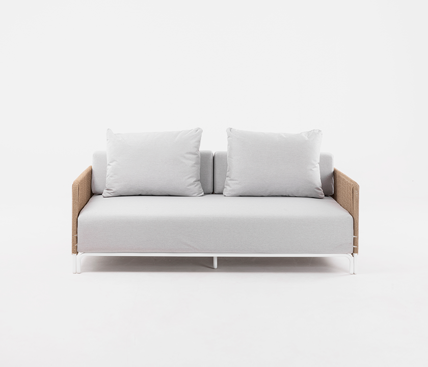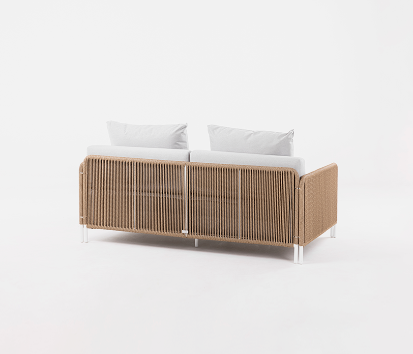 Designed with plush cushions in soft gray fabric and a powder-coated aluminium frame for durability, this sofa enhances both indoor and outdoor living. The natural rope detailing adds warmth and texture, making it the perfect centerpiece for terraces, lounges, or contemporary interiors.