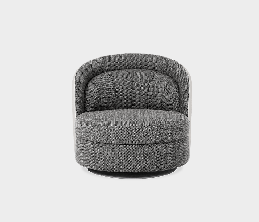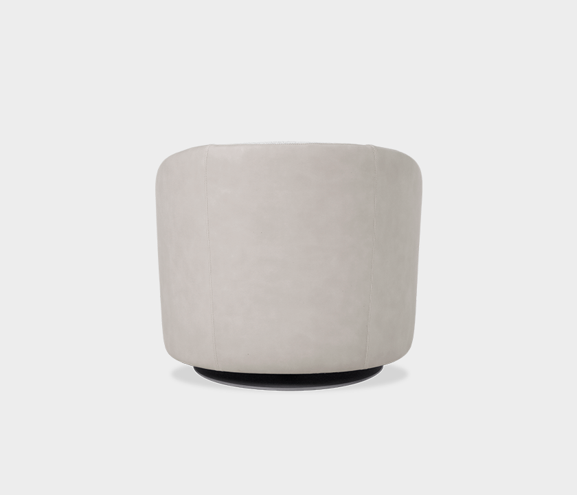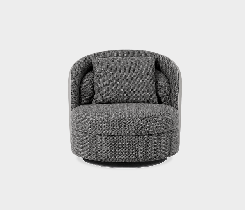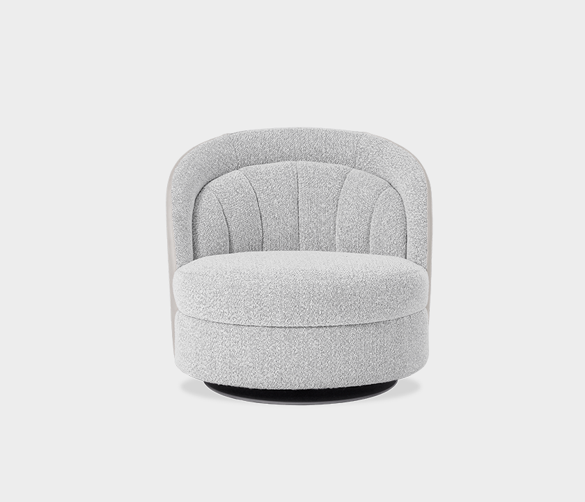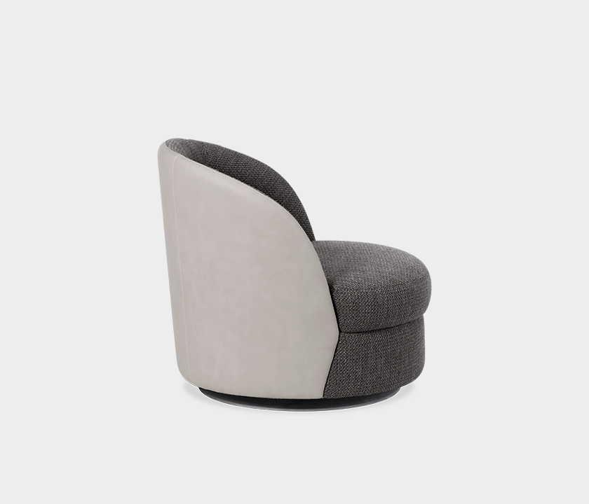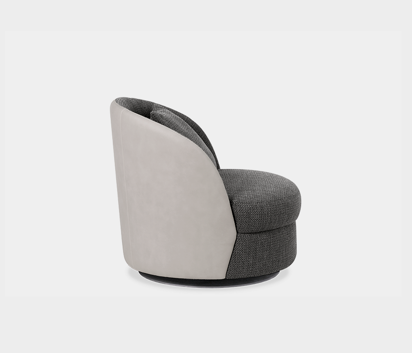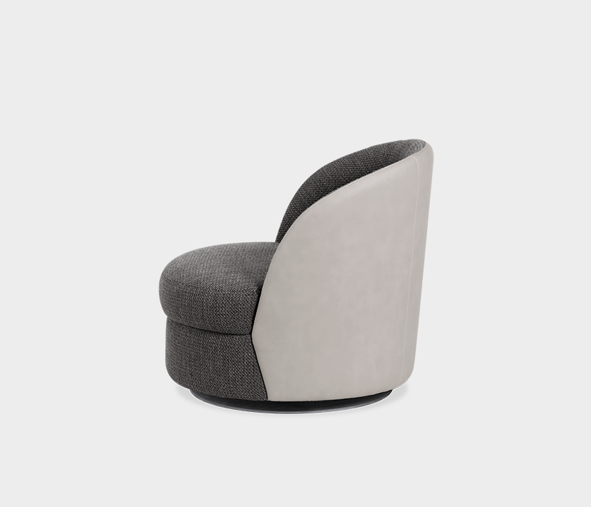 With soft shapes and enveloping proportions, this swivel armchair combines comfort and sophistication in a contemporary design. The fabric upholstery provides a cozy texture, while the leather-covered sides create an elegant contrast of surfaces. The hidden swivel base provides practicality and fluidity in use, making it ideal for living rooms, lounges or suites with a refined atmosphere.