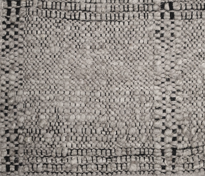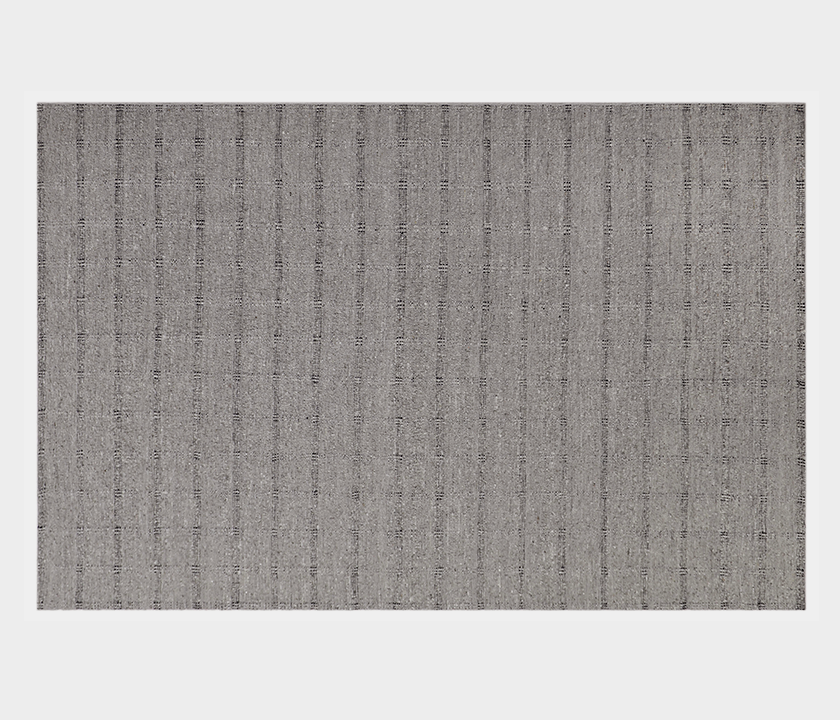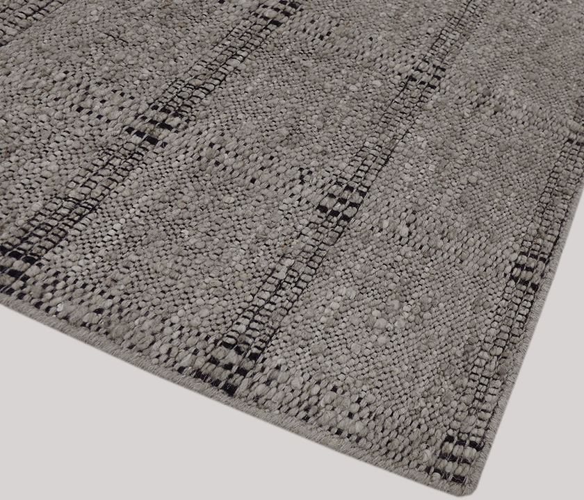 100% wool rug in gray, hand-woven with reinforced edges and fringe. Soft, dense, and eco-dyed. Durable design for modern and high-traffic interiors.