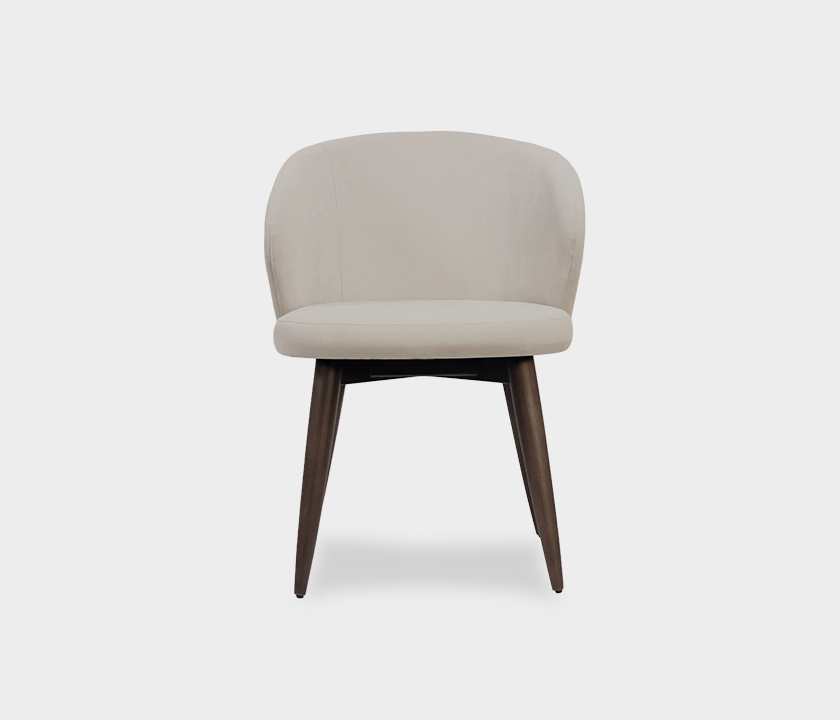 With enveloping lines and carefully balanced proportions, this chair expresses the elegance of contemporary design through a warm and refined language. The curved backrest gently embraces the body, offering comfort and ergonomic support in a structure that combines visual lightness with solid craftsmanship. The wooden legs reinforce the formal purity of the piece, highlighting the dialogue between natural materials and sculptural lines. A versatile element that integrates seamlessly into dining rooms, offices, and social spaces, bringing quiet sophistication to any setting.