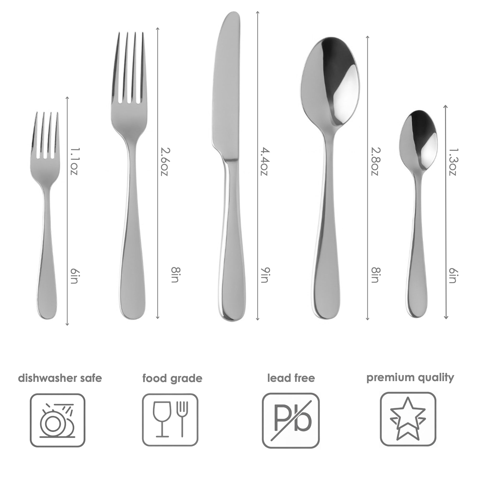 Contents: 30 pieces (6 dinner knives, 6 dinner forks, 6 dinner spoons, 6 dessert forks, 6 teaspoons).