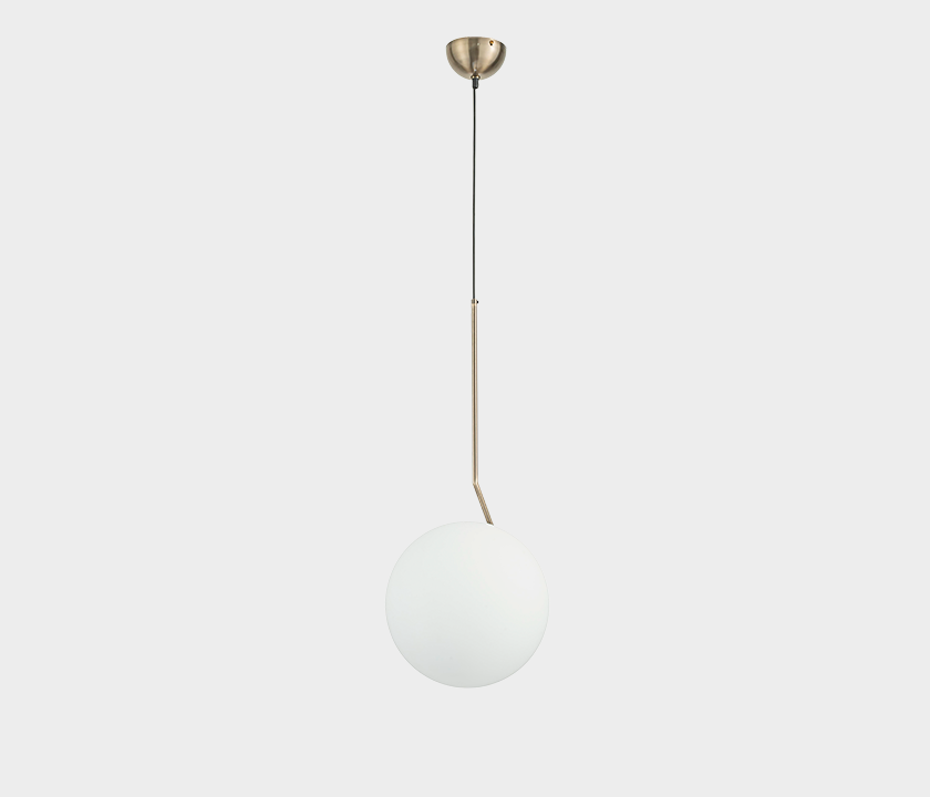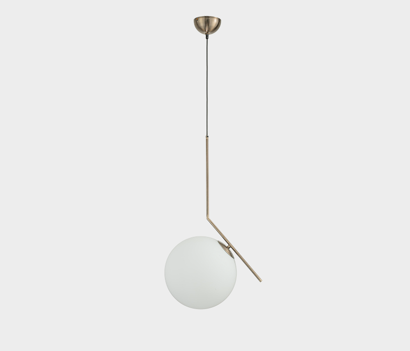 Featuring a sleek metal structure with a satin gold finish and a milky glass sphere at the end, this pendant delivers soft, ambient lighting with a refined aesthetic. Ideal for dining areas, kitchen islands, or bedside illumination.