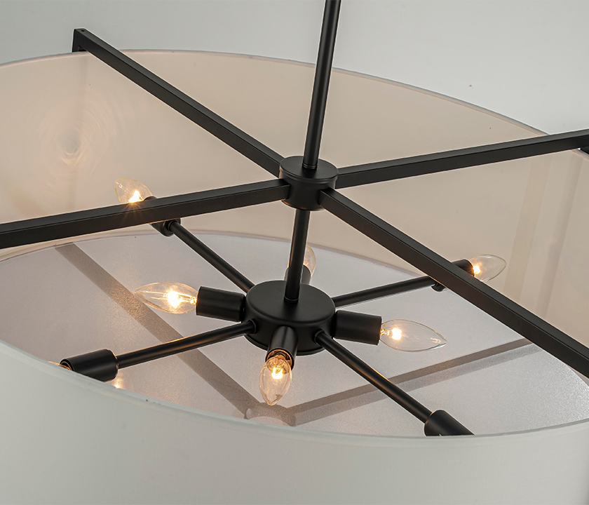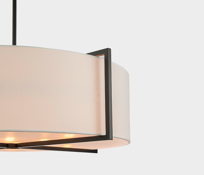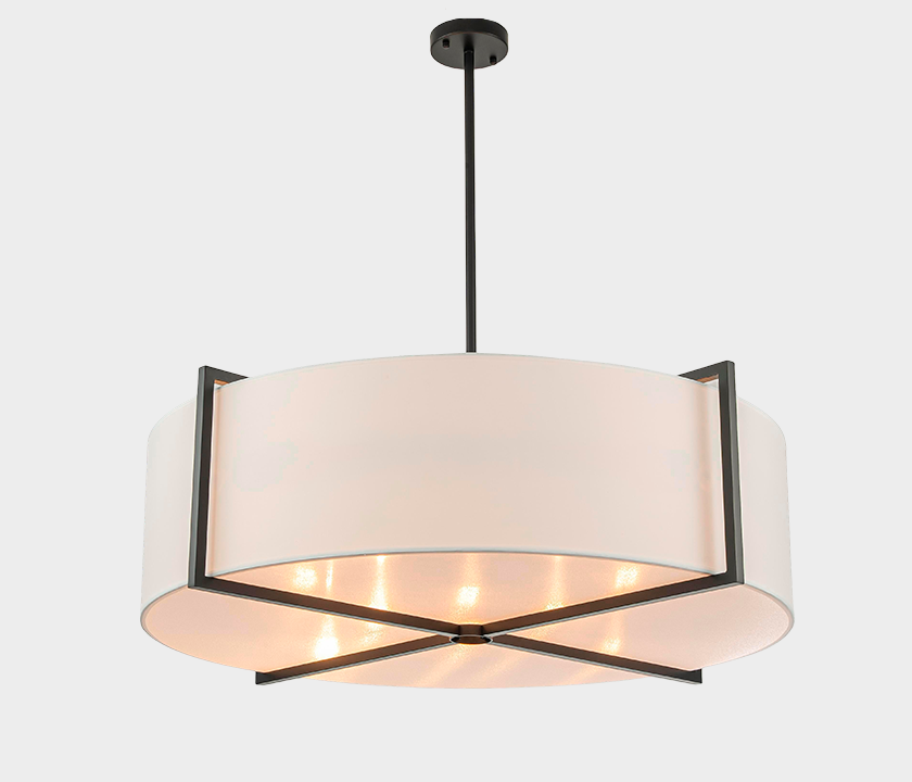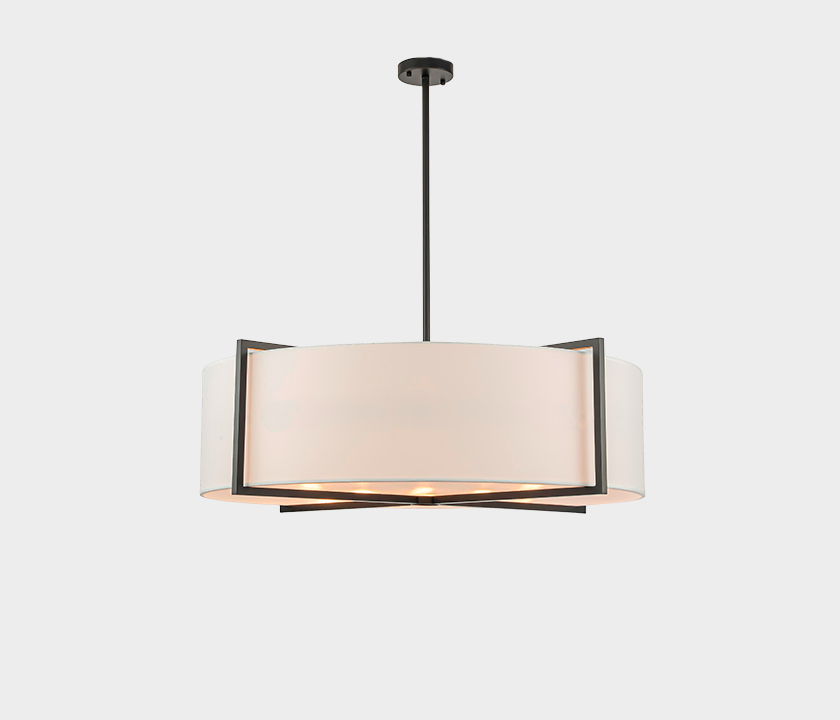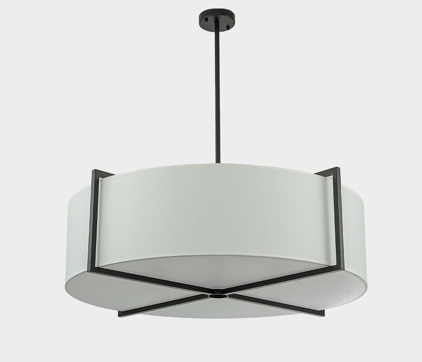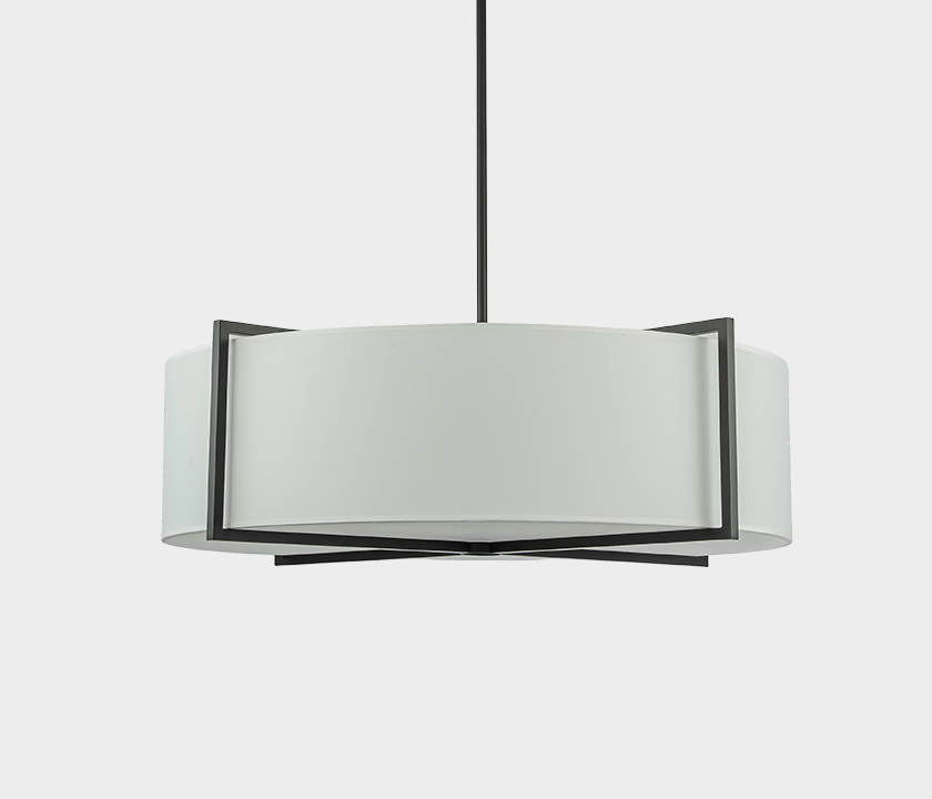 Pendant light with a metal structure and a linen fabric lampshade fitted between the X-shaped structure.