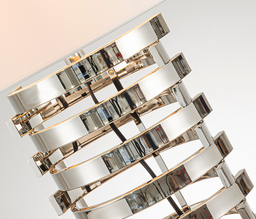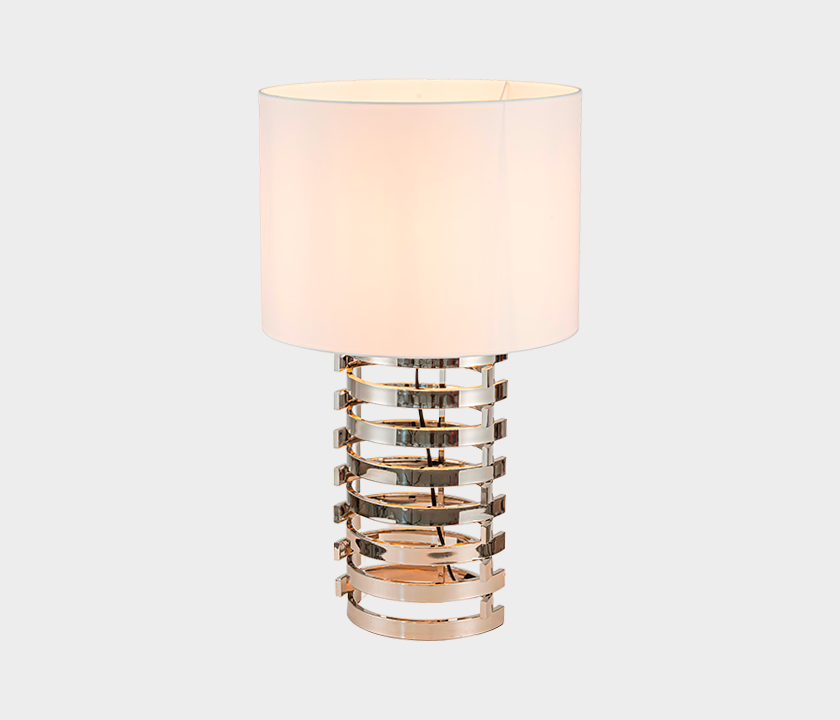 Metal strip structure with a linen fabric lampshade.