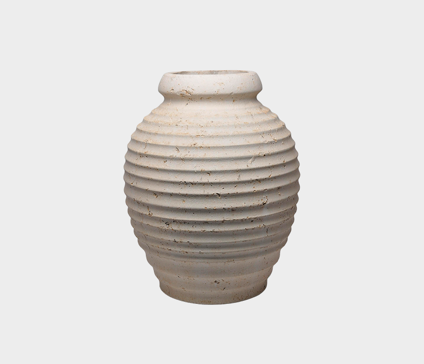 Inspired by ancient pottery, this ribbed ceramic vase features a rounded silhouette and a weathered white finish that adds depth and character. The raised linear texture enhances its sculptural appeal, making it ideal as a centerpiece on shelves, consoles, or dining tables. Perfect for rustic, coastal, or wabi-sabi interiors.