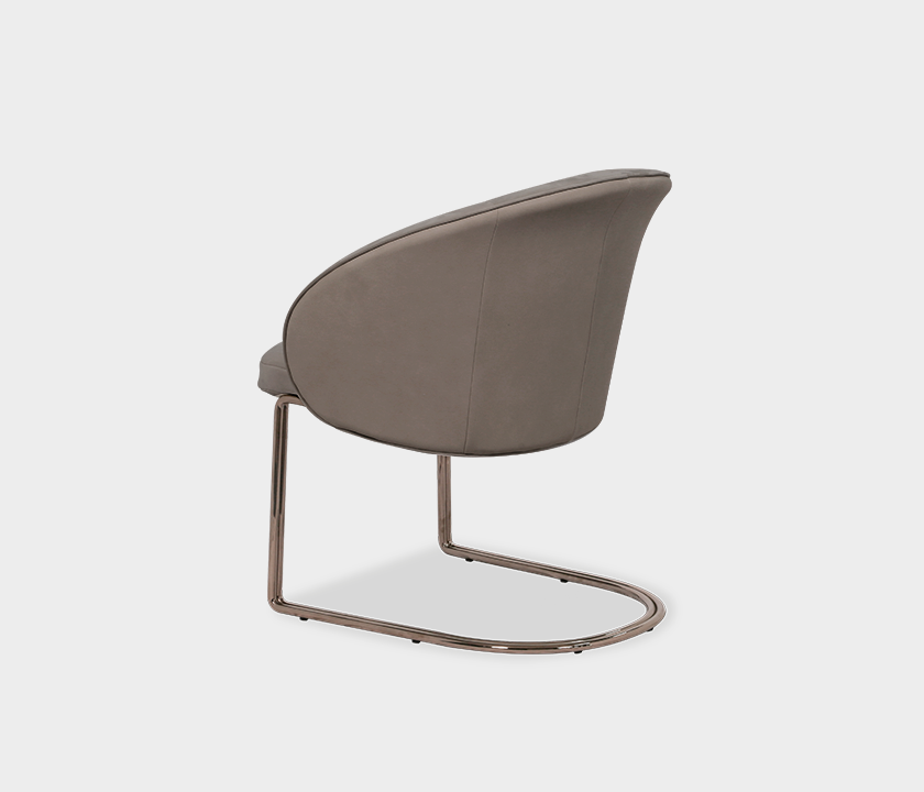 Upholstered in a velvety-touch fabric in a refined neutral tone, Elba offers a rich tactile and visual experience. The subtly curved metallic base ensures stability and presence while emphasizing the chair’s contemporary character.
