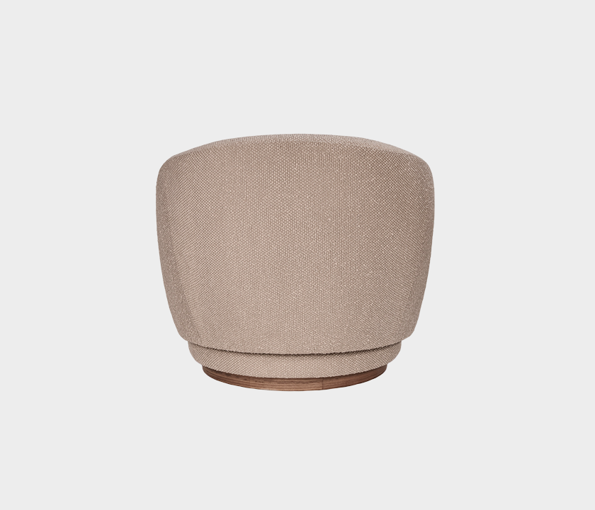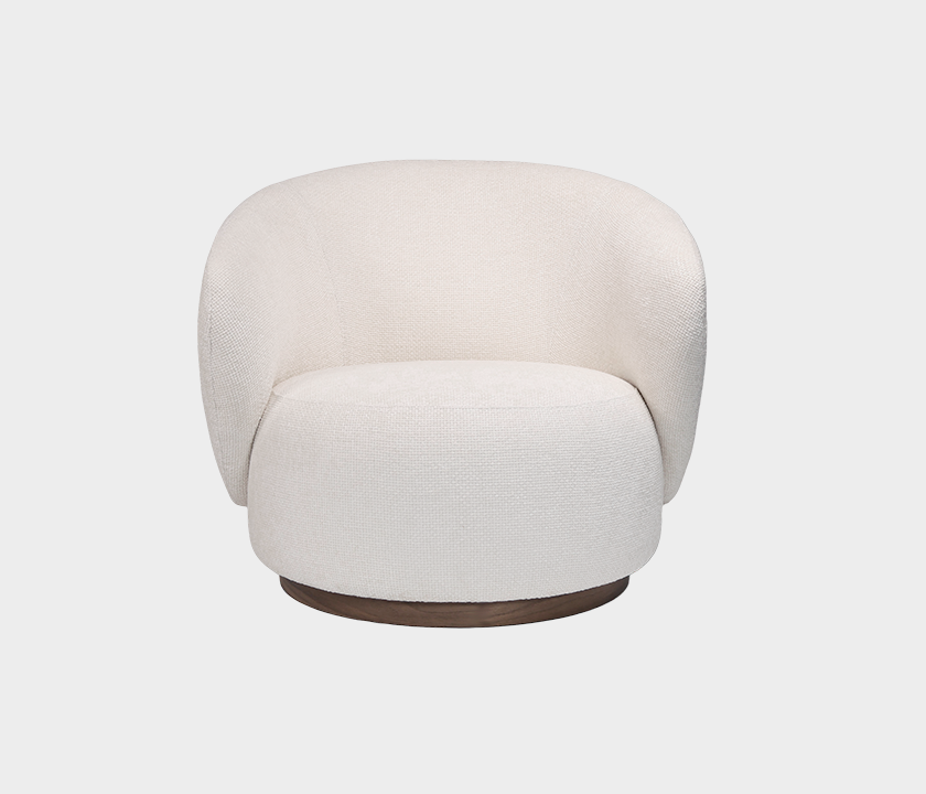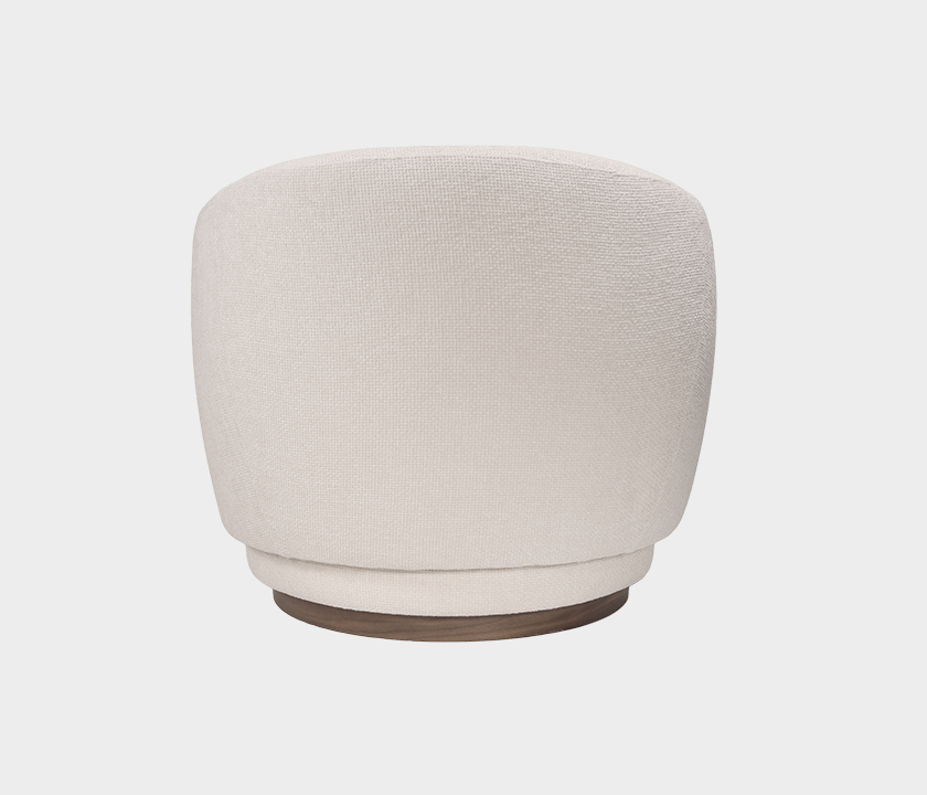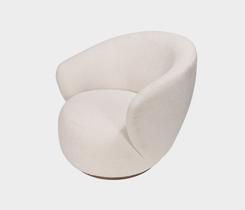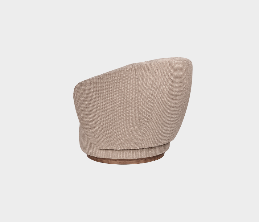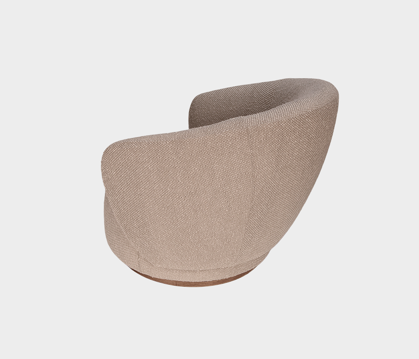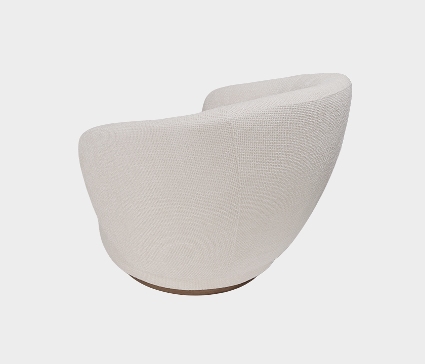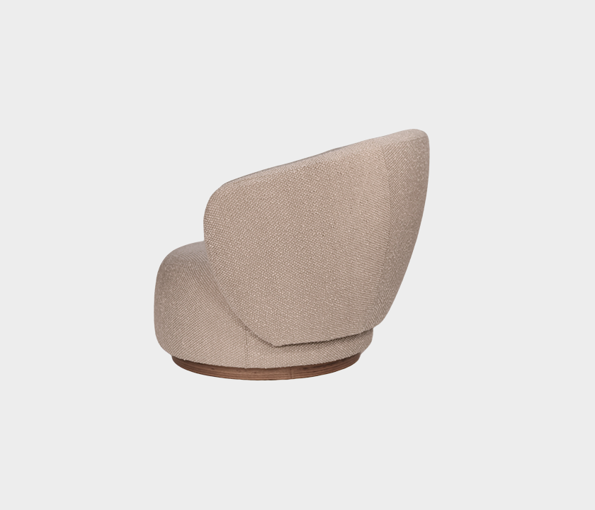 Featuring generous curves and a textured finish, this armchair blends comfort and elegance in a sculptural design. The wraparound backrest gently embraces the body, while the circular wooden base adds warmth and sophistication. Perfect for living rooms, lounges, or relaxation areas with a contemporary and inviting aesthetic.