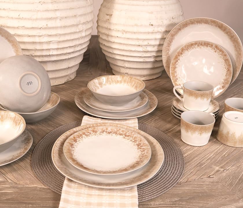 The Ravello Stoneware Drip-Glaze Dinnerware Set includes 20 pieces designed to add artisanal elegance and warm tonal detail to your table. Crafted with a soft ivory base and accented by hand-applied sandy beige glaze that flows along the rim, this set offers a refined balance of natural texture and contemporary design — perfect for both everyday dining and elevated entertaining.