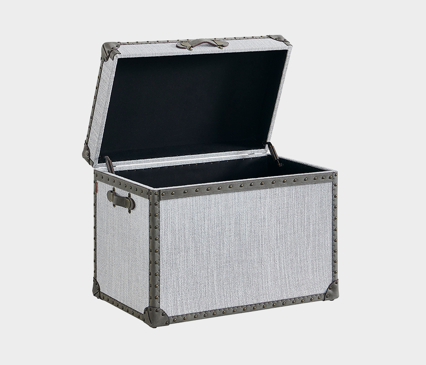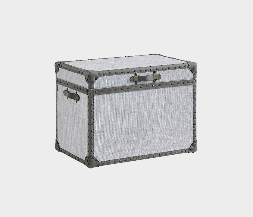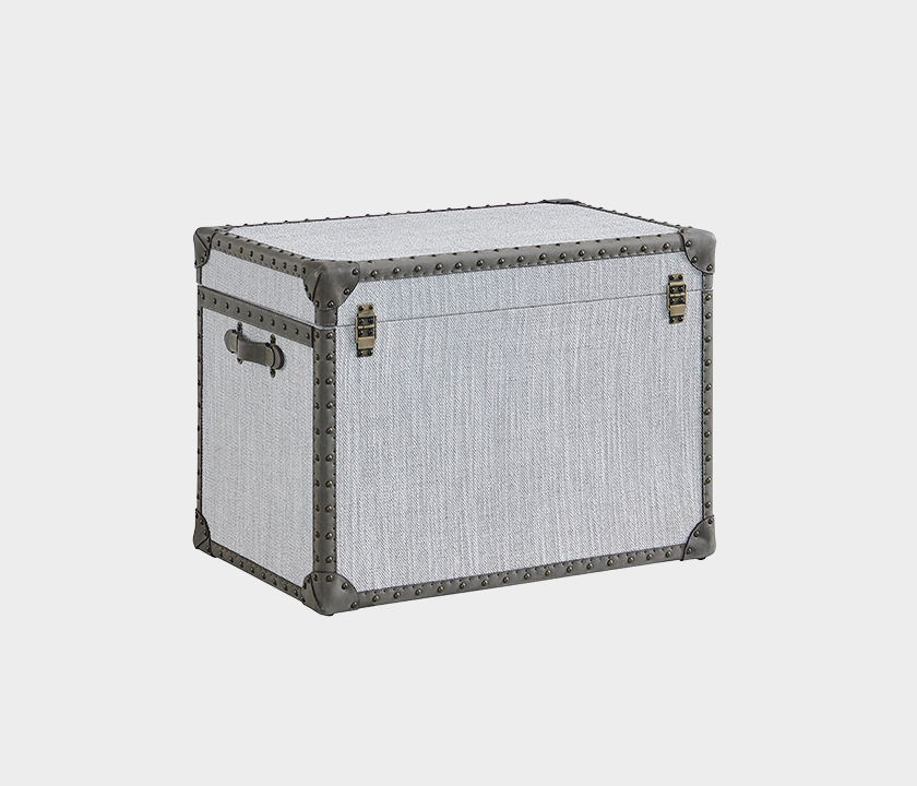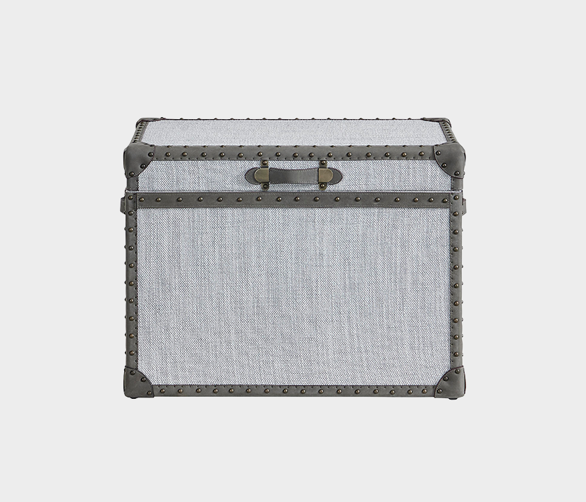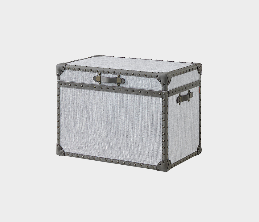 Timeless and refined, this trunk is wrapped in light linen fabric and framed with graphite-finished metal profiles accented by decorative studs. Perfect as a support piece, storage solution, or design statement, it blends discreet elegance with natural texture and functional appeal
