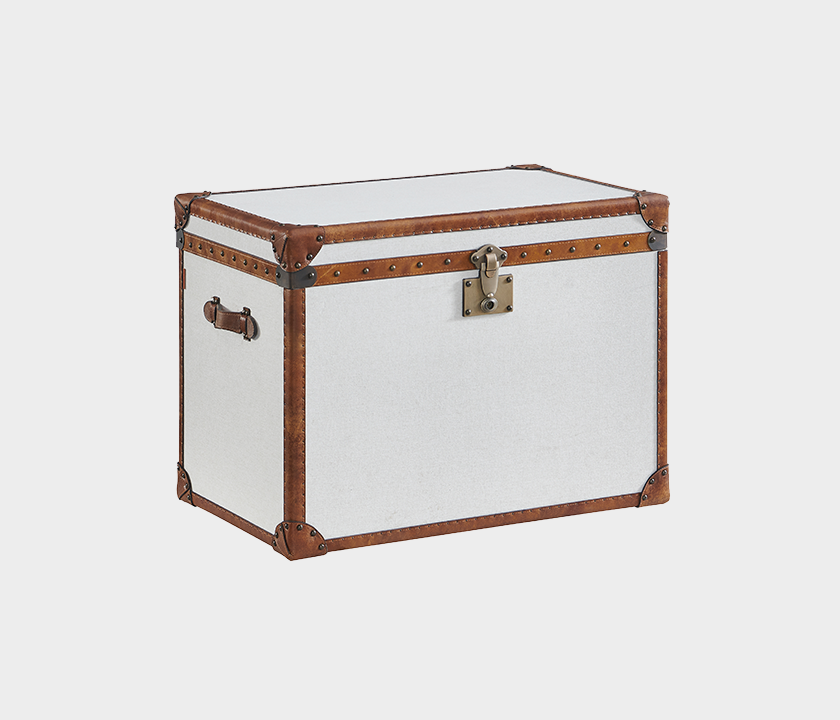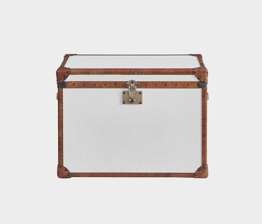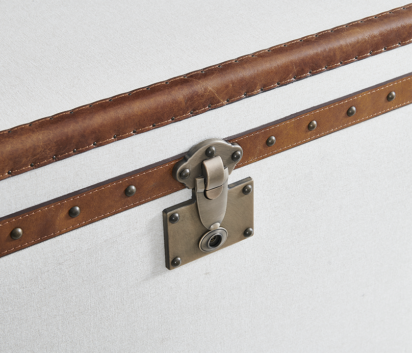 Featuring a classic silhouette and refined finish, this trunk combines light fabric panels with leather trim and aged metal hardware. A versatile piece that serves both as stylish storage and a decorative accent — perfect for interiors that value authenticity and timeless elegance.
