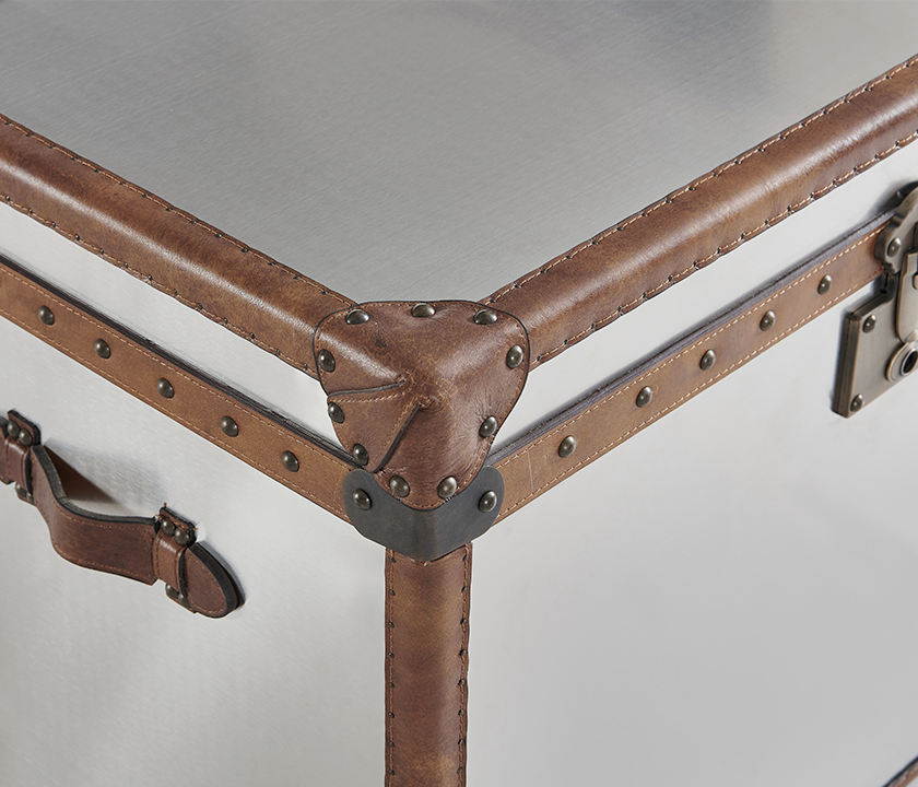 This functional and elegant trunk draws inspiration from classic travel chests with a reinforced structure. Featuring a brushed metal finish, leather corner accents, and studded detailing, it adds character and versatility to spaces like living rooms, entryways, or bedrooms. A piece that blends nostalgic charm with modern utility.