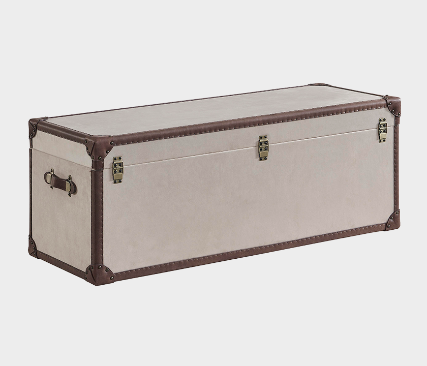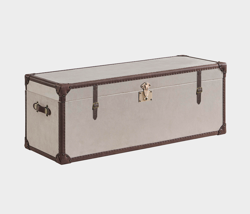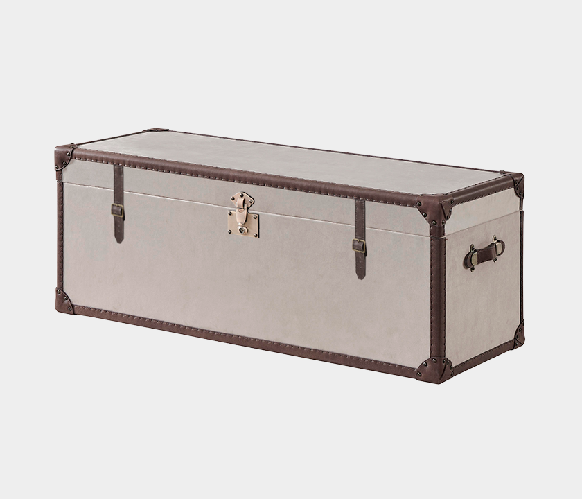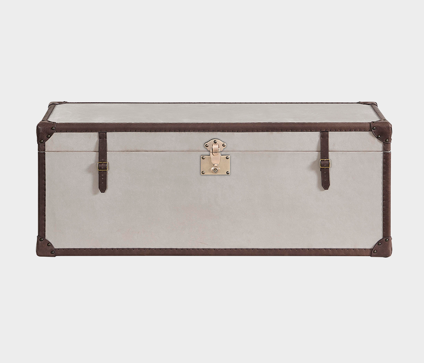Inspired by vintage travel trunks, this piece blends light fabric upholstery with brown leather detailing and decorative buckle straps. A central metal latch and reinforced corners enhance its classic yet functional character. Perfect for living rooms, bedrooms, or closets that call for refined elegance and smart storage.