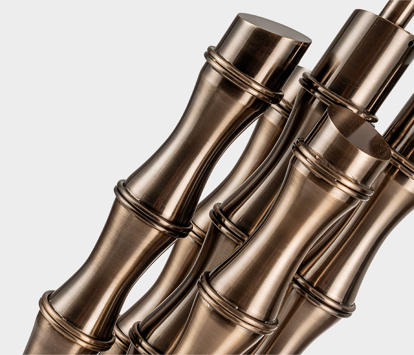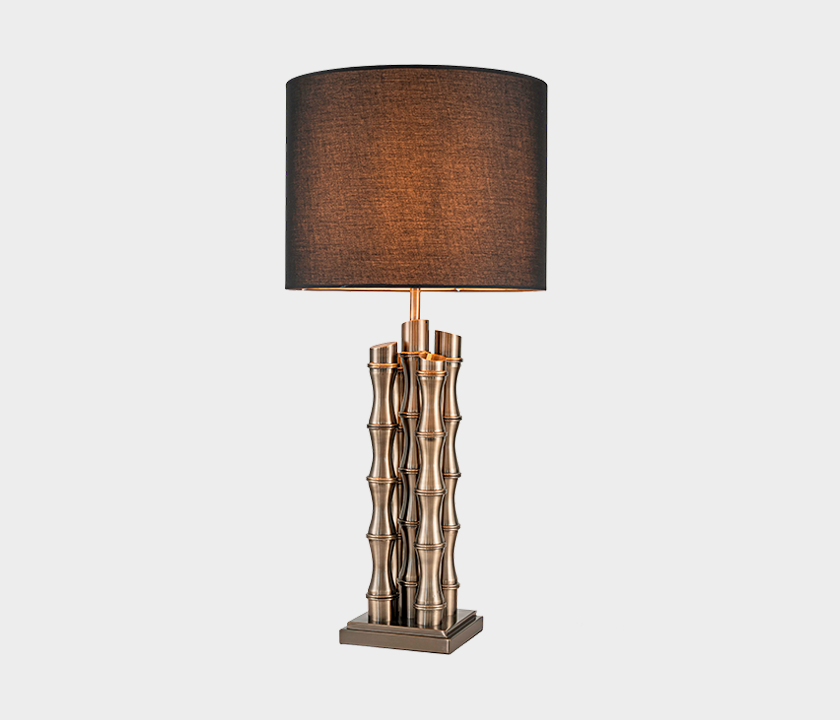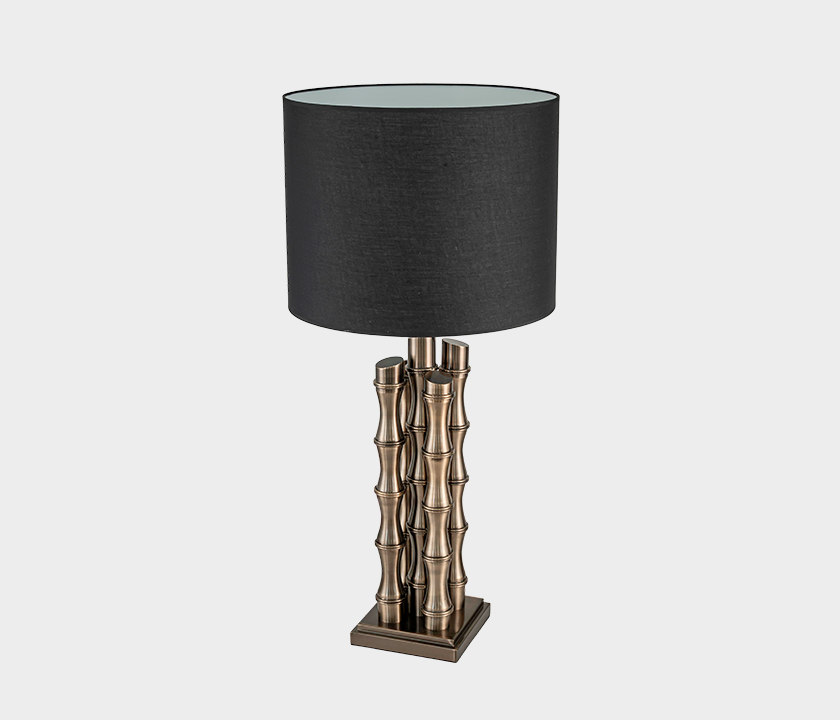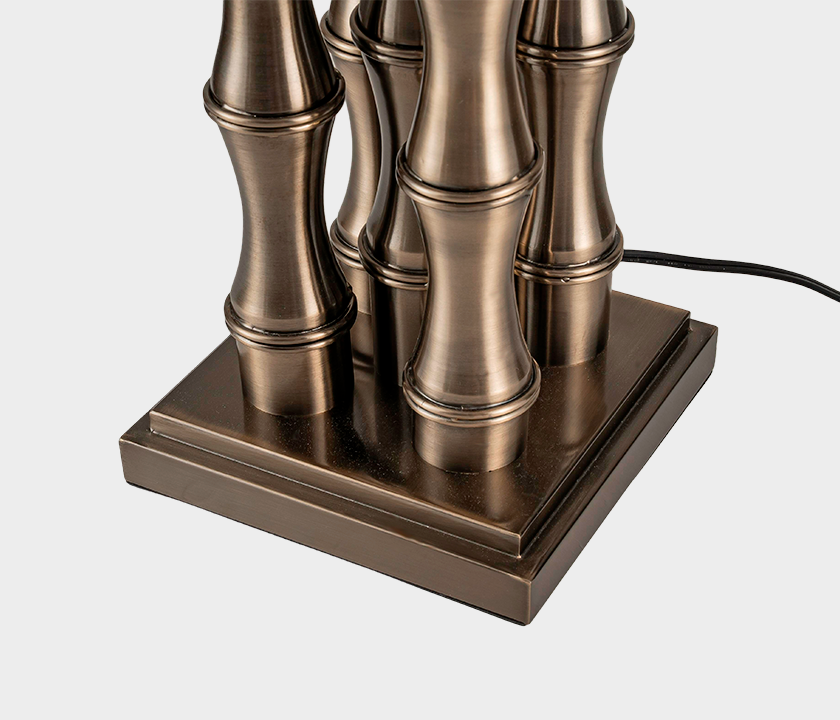 Metal base in the shape of bamboo with a linen fabric lampshade.