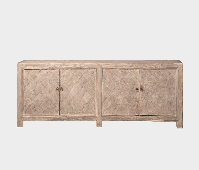 This console blends functionality with artisanal refinement. Crafted in natural-finish wood, it features carved geometric doors that add texture and visual rhythm to the piece. With generous internal storage, it's perfect for dining rooms, living spaces, or social areas that call for understated sophistication and bold character. A balance between tradition and contemporary design.